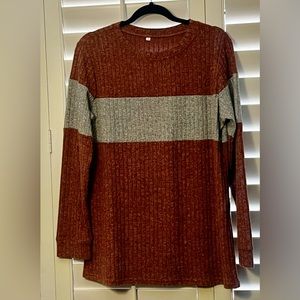 This beautiful rust and gray sweater is so soft. It can be worn with leggings or jeans. The two colors and ribbing makes it unusual! I loved it so much, I bought it in many colors. See my other listing. Washes easily.
