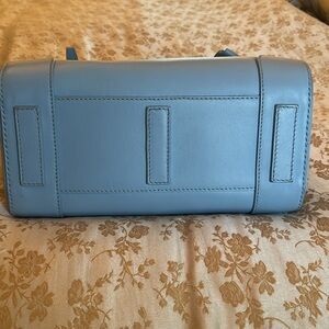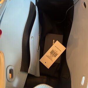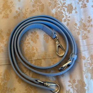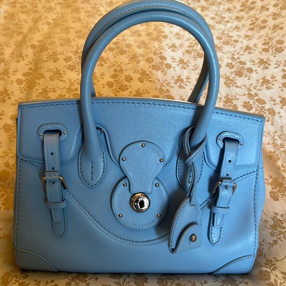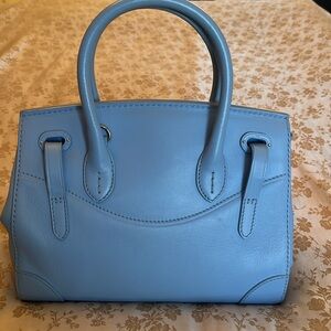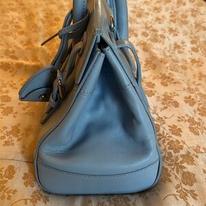 Nappa pale blue. Brand new. Calfskin. Made in Italy. Two leather top handles with removable adjustable leather crossbody strap. Includes a dust bag and card of authenticity. Width 10” height 10” depth 7”