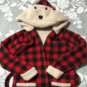 Lucy & Laurel super soft plush robe. Black and red checkered with khaki colored inside. Has pockets and a tie around the waist. Also has a bear face on hood of robe. My son wore this, and loved it!