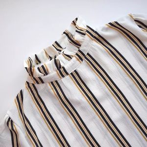 Soft to touch and lightweight blouse featuring rifles trimming on neckline and wrists, pearl button closure back of neckline, slightly stretchy for comfort.