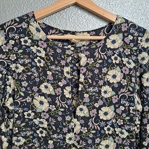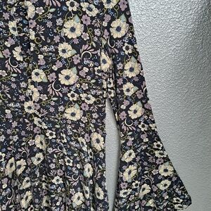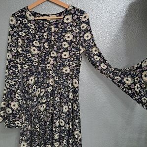 Embrace elegance with this floral long sleeve dress. Perfect for any occasion, this dress features a beautiful black and cream floral pattern with a front key hole, round neckline & bell sleeves