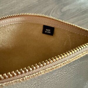 Classic foldover envelope pouch for day or evening, 9.5" by 9.5" when fully open. Supple silver leather with a natural leather tassel and light tan zipper. No inside pockets. Used once or twice, stored in an airtight container.
