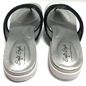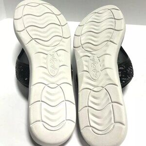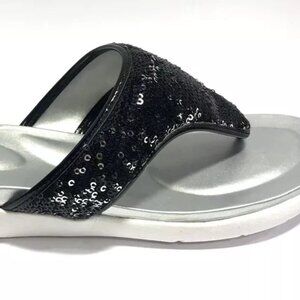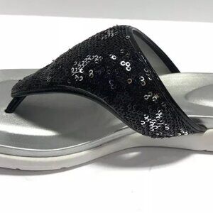 Chic black sequined sandals. Comfortable silver footbed. Perfect for casual outings.
