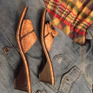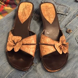 Soft Style is made by Hush Puppies so these slides offer comfort along with style. The man made material looks like cork with faint gold flecks. A small heel dresses them up along with the flower detail. Size 7 1/2 M and in excellent condition.