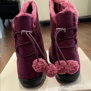 Chic plum boots with cozy lining. Stylish and warm for winter.