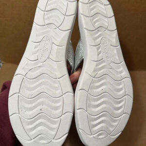 Beautiful sparkly silver Soft Style by Hush Puppies flats/flip-flops/sandals. Glitter upper, cushioned footbed.