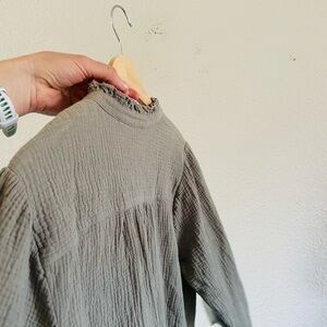 Stylish olive green button-up dress with long sleeves. Gauzy material