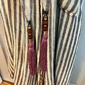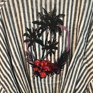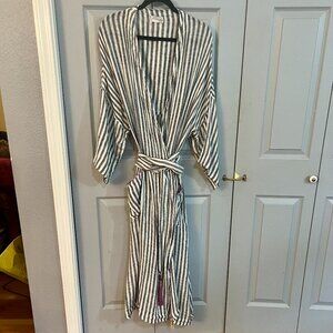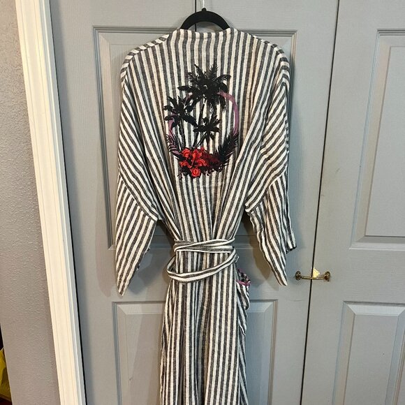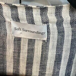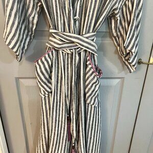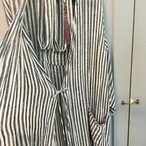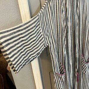 Soft Surrounding Inland Summer Robe. Made of a light airy cotton, pinstripe black & white. Made for comfort and very soft with a Inland print on the back. I did hand mend a seam on the side and it's not noticeable, last photo.