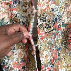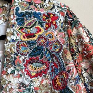DETAILS: Soft Surroundings Ariege style. Floral collage color way. Eyelet style with semi-sheer 3/4 length sleeves. Hook and eye closures. Really cool embroidery along shoulders. Polyester, machine wash. $160 retail.
