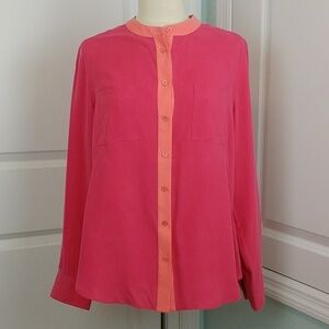 Color block soft washable silk button down blouse in pink with coral accents, front pockets, long sleeves, button cuffs, mandarin collar.