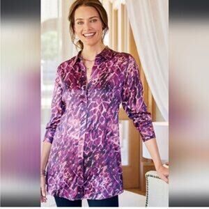 Soft Surroundings 100% Silk Purple Animal Print Button-Up Tunic Shirt