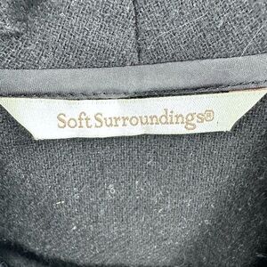 This Soft Surroundings cardigan is the perfect addition to any wardrobe. With a cozy wool blend material, it's perfect for those cooler days. The purple and black plaid pattern adds a touch of fun to your outfit, while the waterfall drape gives it a chic and trendy look. It's sized at 1X and is a plus size cardigan, perfect for any woman. The cardigan is pre-owned, but in excellent condition. Get ready to turn heads with this stylish sweater.