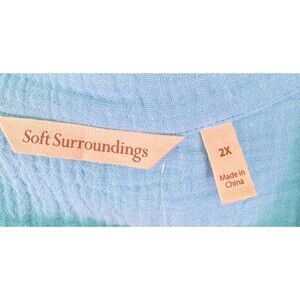 Beautiful Soft Surroundings textured gauze button-front top in a soft turquoise blue shade, size 2X. This lightweight blouse features a relaxed, easy fit with long sleeves, side slits, and a breathable crinkled gauze fabric thats perfect for layering or wearing on its own. Excellent condition with no flaws. Easy, comfortable, and effortlessly stylish.