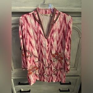 Soft Surroundings Altea Pink & White Ikat Embroidered Beaded V-Neck Tunic