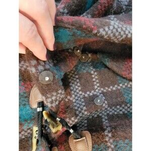 Excellent condition with no stains, pills or defects Soft Surroundings Aspen Plaid Sweater Coat Size Large. Woven fabric. Two snap hidden closure, toggle button closure in front. Shawl collar, long sleeves. Wool Blend 37% wool 32% nylon 14% alpaca 7% spandex. Alpaca fibers stick out at places as white hairs. Very soft warm and cozy.