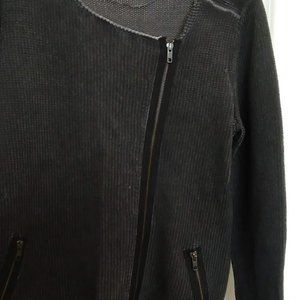 Stylish grey sweater with asymmetrical front zipper. Zippered cardigan with black accent zippers in front. Super cute sweater. Never worn. Approx. measurement lying flat almost 19 inches pit to pit.