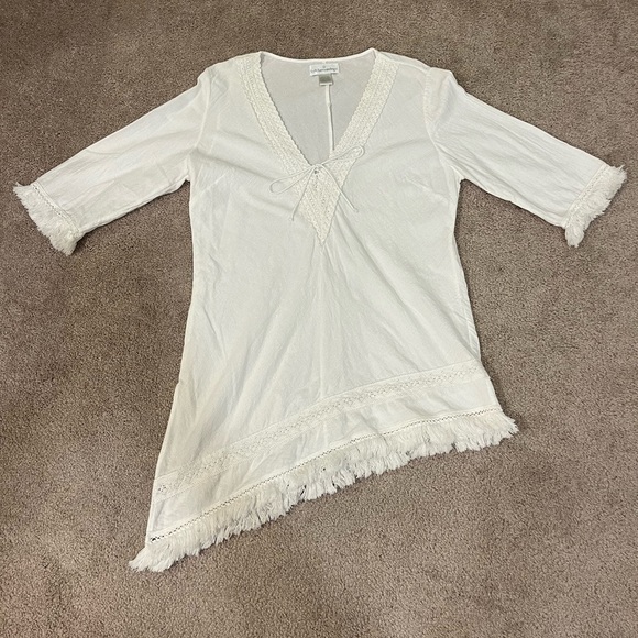 In great shape! All white blouse with fringe and crochet accents! Deep v-neckline with slightly longer sleeves. Asymmetrical cut on the bottom makes it very flattering! 100% cotton material! Perfect for work or a night out! Offers welcome!