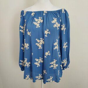 Size medium Soft Surroundings Avignon Floral Embroidered Blue Top. 100% rayon. Embroidery 100% cotton. Could be worn on or off the shoulder. Rounded elastic neckline. 3/4 sleeve with elastic cuff hem. Pit to pit 20.5" Excellent pre-owned condition.