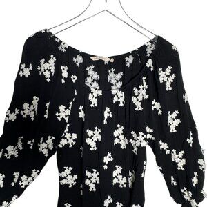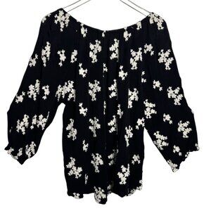 Designed in a flattering peasant-style silhouette, this blouse features black fabric with intricate white floral embroidery for an elegant contrast.