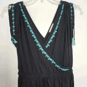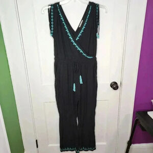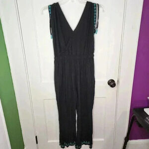 Soft Surroundings Baja Jumpsuit Black Turquoise Embroidery Tassel Size Small