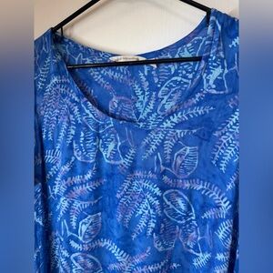 Batik tropical leaf floral print in blue and purple, cold shoulder, short sleeves, light weight, loose fit, unlined, maxi fit, pockets, soft, curved neckline