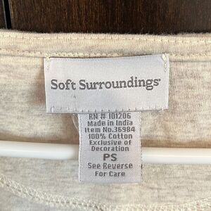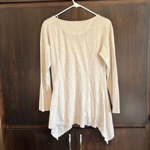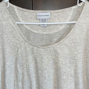 This top is made by Soft Surroundings. It’s a heathered oatmeal color, with a shark bite hemline, long sleeves and a beautiful beaded neckline. Size small petite and in very nice pre owned condition. Smoke and pet free home.