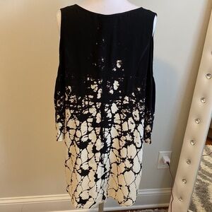 Lightweight tunic length top. Black and ivory tie dye like print. Split neckline. 3/4 length bell sleeves. Cold shoulders. No fabric content label. 33” shoulder to bottom. 20” armpit to armpit.