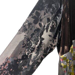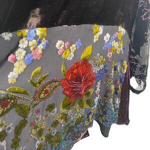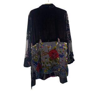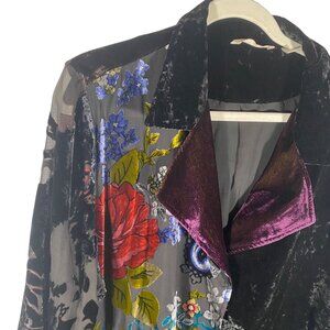 Elegant black velvet jacket with vibrant floral patterns. Features rich red and blue accents. Perfect for a stylish look.