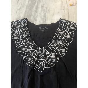 Black knit tunic top with embroidered white leaf design at neck edge, short sleeves