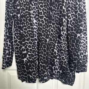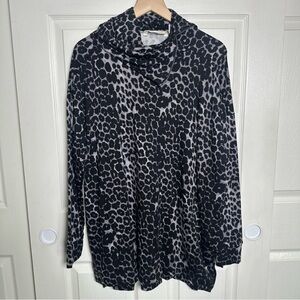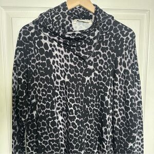 The Soft Surroundings XL Sweater is a stylish and comfortable tunic featuring a black and gray animal print design, perfect for casual occasions. Made from a blend of polyester and rayon in a tight-knit fabric, this sweater has a turtleneck and long sleeves for added warmth. With a regular fit and pockets for convenience, this sweater is a versatile addition to any woman's wardrobe, suitable for winter, fall, and spring seasons. Designed by Soft Surroundings in the United States, this sweater is a blend of classic and contemporary styles.