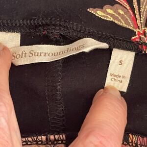 Excellent preowned condition Soft Surroundings Pants are stretch knit. They are black with coral red brown and metallic. Gold print. Wide waistband straight legs. See last photo for measurements.