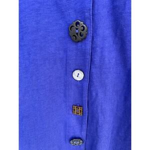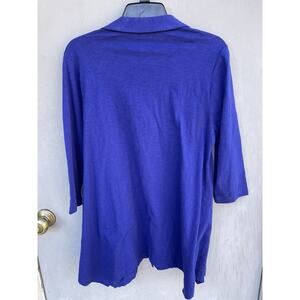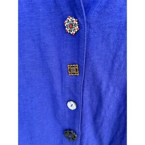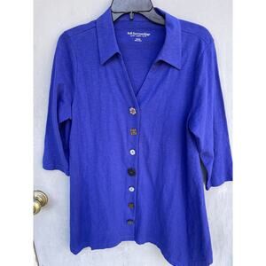 Elevate your wardrobe with this stunning Soft Surroundings blouse in a beautiful shade of blue. The collared neckline and snap closure add a touch of sophistication, making it perfect for travel, casual outings, and business meetings. This tunic-style top, crafted from 100% cotton knit fabric, features classic/fitted sleeves and a 3/4 sleeve length, making it a versatile piece for all seasons. The button-up design with a sharkbite hem and solid pattern is accented with artsy buttons, adding a designer touch to this colorful blouse. It's machine washable, making it easy to care for, and available in size M for a regular fit. Don't miss out on this must-have addition to your wardrobe, perfect for any occasion. Style #28157