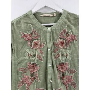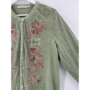 Soft Surroundings Blouse Womens XL Green Pink Floral Embroidered Button Up Tunic