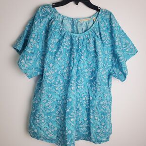 Soft Surroundings Blue Floral Boho Cotton Peasant Blouse Size XL