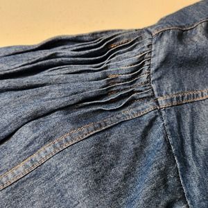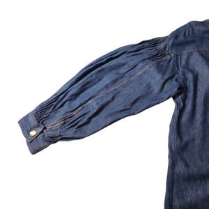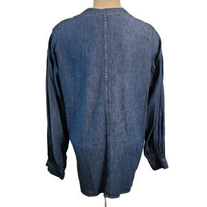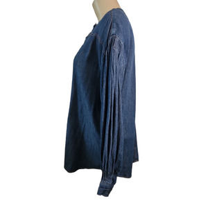 This is a Blue Grotto denim chambray blouse or shirt from Soft Surroundings. It is a viscose and linen blend fabric with a medium blue denim wash. The shirt has a hidden snap placket with a snap tab collar. Note that the top snap has some of the color worn off - see 8th photo. The blouse has pintucking on the shoulders and the cuffs of the balloon sleeves. It is in very good pre-owned condition.