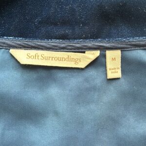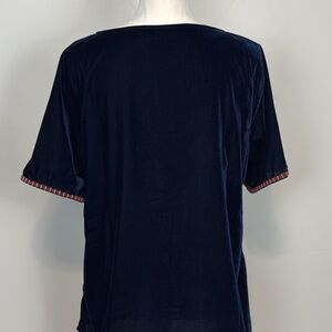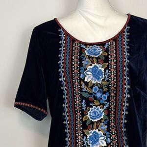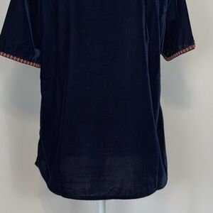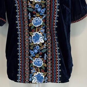 Soft Surroundings Blue Lilian Velvet Top. Size medium. In good preowned condition. No stains or holes. Boho style embroidery down the front and on bottom of sleeves. Dark Navy Blue. Pullover. Armpit to pit measures 19 inches. Total length 26 inches. Comes from a smoke free home.