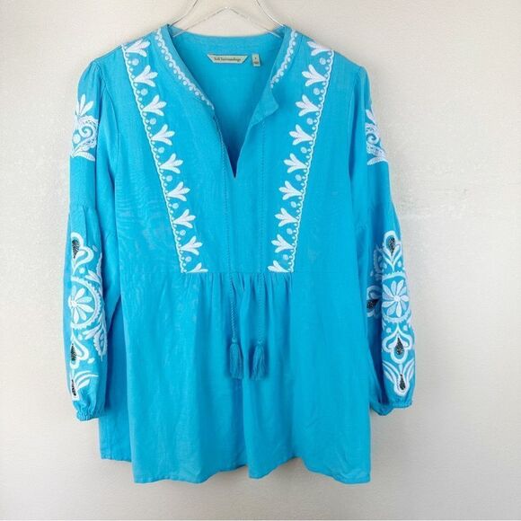 Soft Surroundings Blue Linen Embroidered Blouse Top Long Sleeve Large