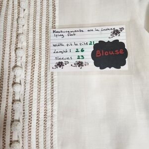 Chic off white blouse by Soft Surroundings. Features delicate lace trim. Ideal for versatile styling.