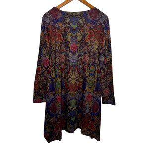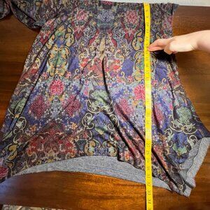 Shark tooth hem, long sleeves, long length tunic top. Dark artsy pattern. Interesting hem line. Flowy and oversized. Soft and stretchy.