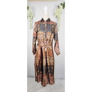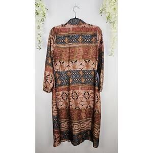 This Soft Surroundings PS Petite dress blends tribal western style with boho Nashville flair. Made of silky polyester in warm blush, blue, and taupe tones, it features a bold geometric print, button-front design, and matching waist tie. Wear it belted as a dress or open as a flowing duster with boots for an effortless country-chic look perfect for concerts or everyday wear.