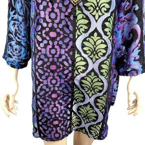 This boho tunic top by Soft Surroundings features an intricate embroidered, beaded V-neck and vibrant multicolor Vistosa Velvet burnout pattern. Made with a comfortable viscose and polyester blend, it offers a stylish and unique look.