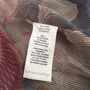 This Soft Surroundings tunic jacket top is a must-have for any wardrobe. The brown/teal color is perfect for any occasion. It features an open front and long sleeves, making it a versatile piece for layering. The material is made of a blend of polyester and spandex, ensuring a comfortable fit.