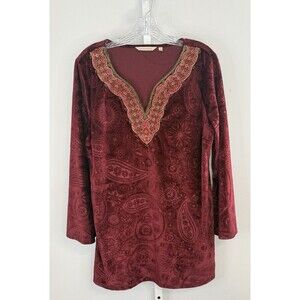 Soft Surroundings Burgundy Velvet Tunic Top L Embroidered Beaded Boho Holiday