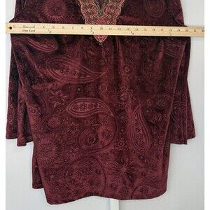 Elegant and eye-catching, this Soft Surroundings tunic features a plush burgundy velvet body embossed with paisley and floral designs, and a striking hand-beaded neckline with gold metallic embroidery.