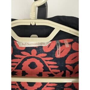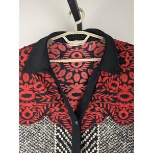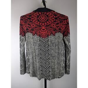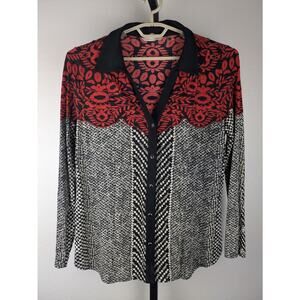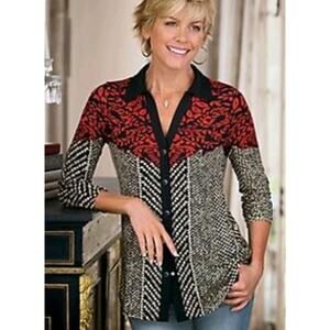 Soft Surroundings size Large Calistoga snap front long sleeve knit top. Collared, v-neck. Black, beige and red abstract mixed print. Stretchy rayon spandex blend.