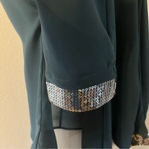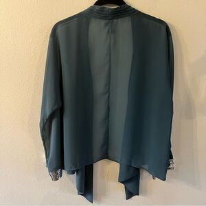 Soft Surroundings Cardigan. Jacket. Topper. Size Large. Blue. 3/4 Sleeves with Sequin Around Cuffs. Sheer. Lightweight. Longer in front. 100% polyester. Length from shoulder to bottom is 30” at longest point in front. In back length is 24”. Open front.