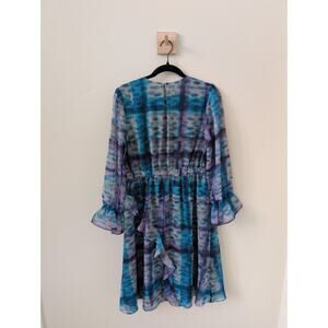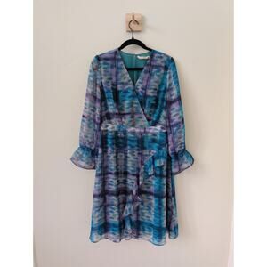 Soft Surroundings Carriage Court Dress - Size Small in excellent pre-owned condition. This dress features a beautiful artistic print and an asymmetrical ruffle that gracefully arches from front to back. The bodice has a faux surplice overlap, complemented by a flat front waistband and a keyhole at the rear neck. The body is lined, while the sleeves are unlined for a comfortable fit. Made from 100% Polyester. Measurements taken flat and approximate: