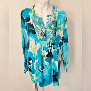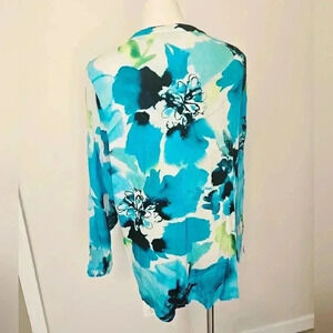 Soft Surroundings Catamara Turquoise Floral tunic top. The material is a semi stretchy 100% Viscose. The body is a semi sheer thicker material than the sheer sleeves. The first photo is a stock photo. Please see pictures for a better description.