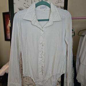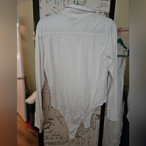 Chic white bodysuit with button-up front. Long sleeves and collared design. Perfect for layering or standalone wear.