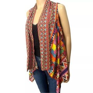 In excellent preowned condition. Open front lightweight topper vest. Super pretty colorful geometric print. Drapes nicely, longer in front than back. Polyester material. Smoke free home
